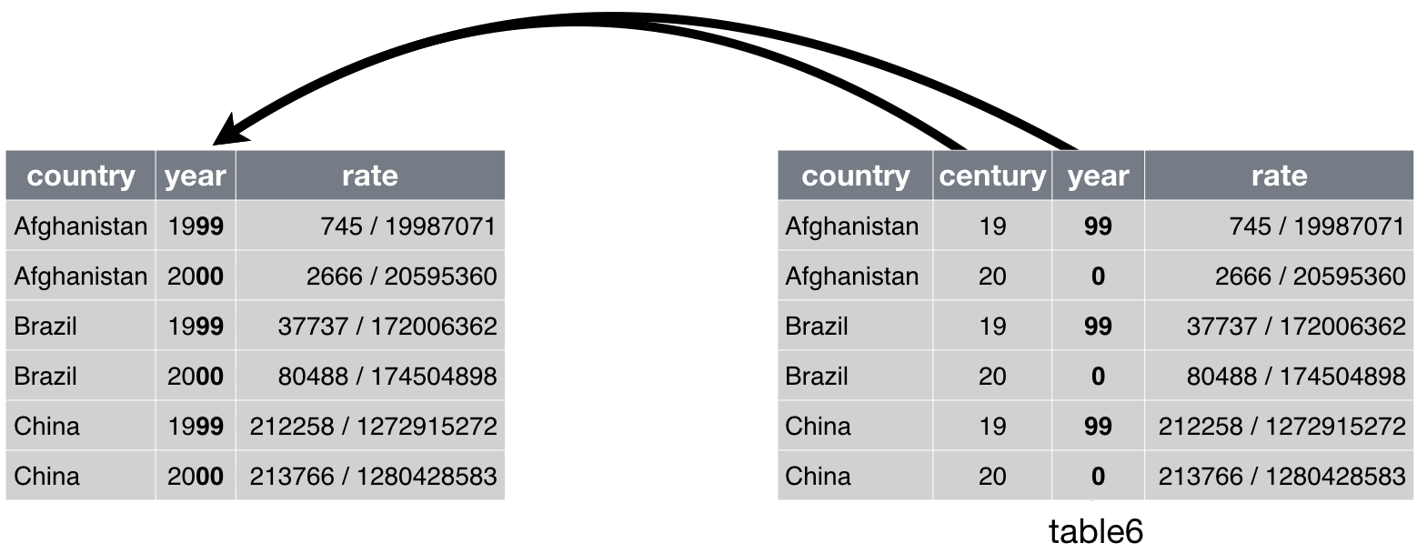 separate(table3, year, into = c("century", "year2"), sep = 2, remove = FALSE)# A tibble: 6 × 5
