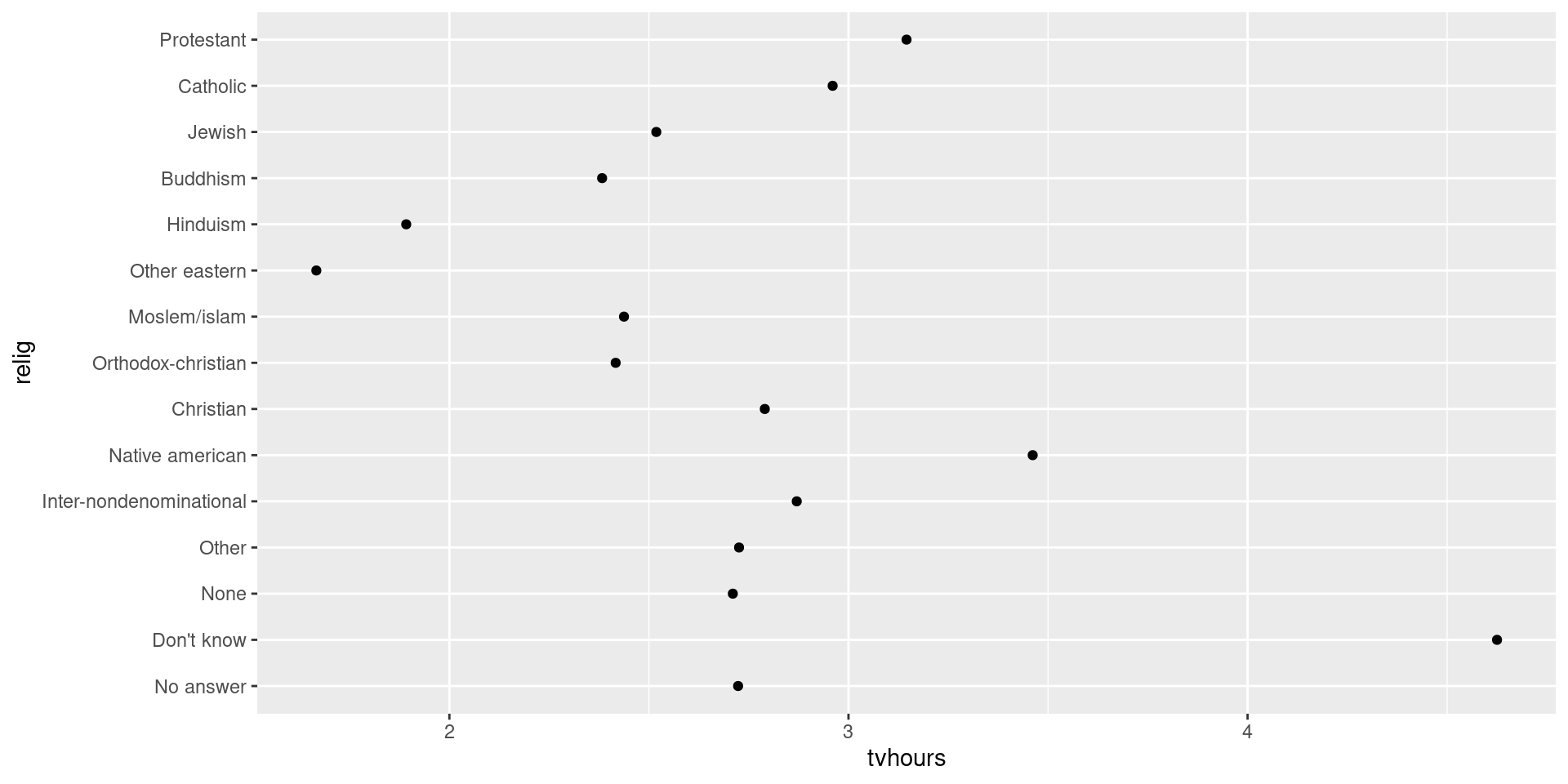 geom_point()ggplot(relig_summary, aes(x = tvhours, y = fct_reorder(relig, tvhours))) +