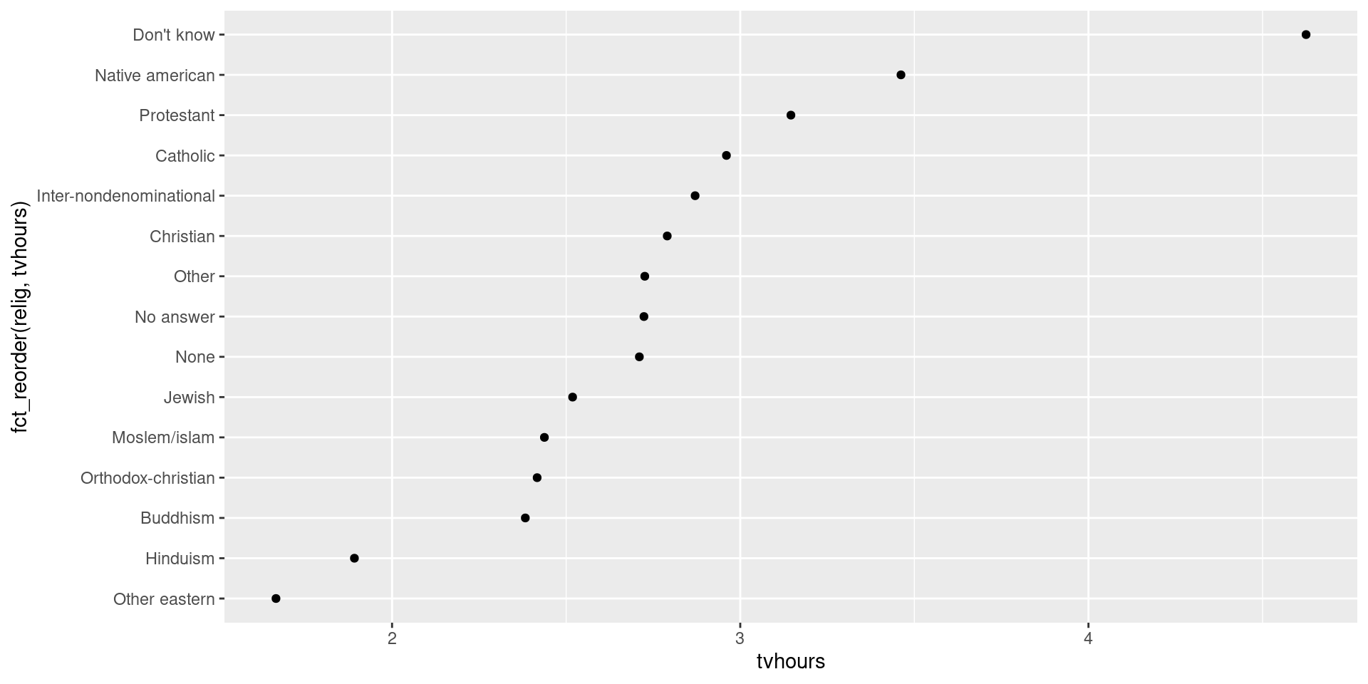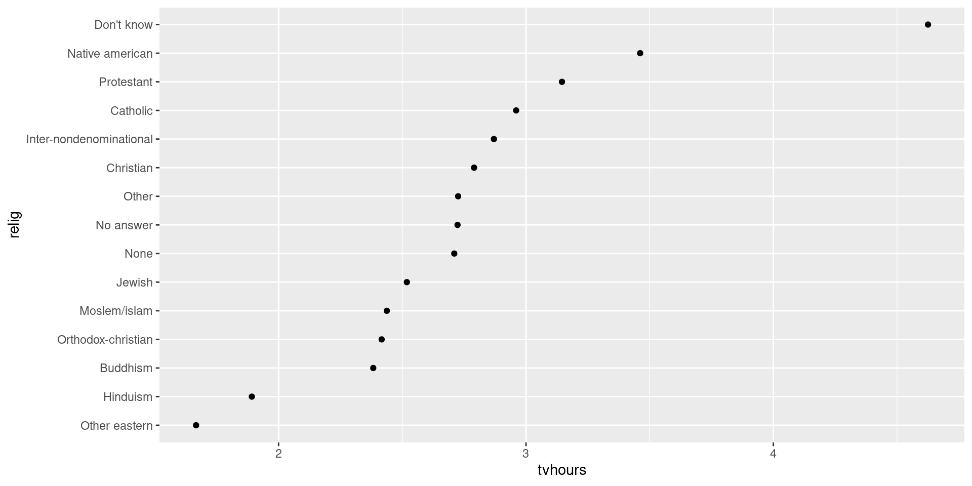 geom_point()relig_summary |> mutate(relig = fct_reorder(relig, tvhours)) |>